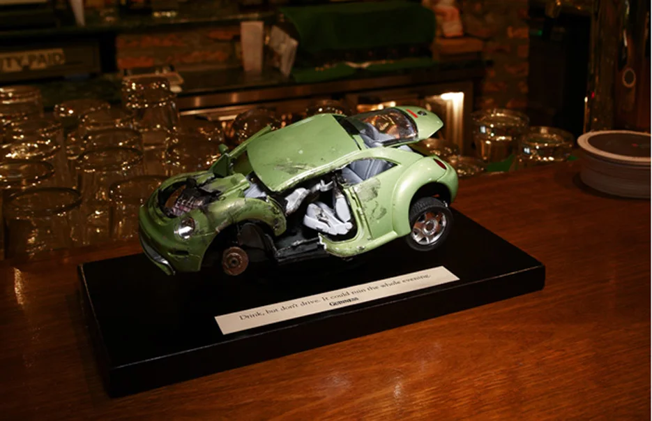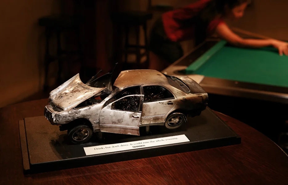 The idea: smashed up 1:18 scale models placed in pubs around Singapore.